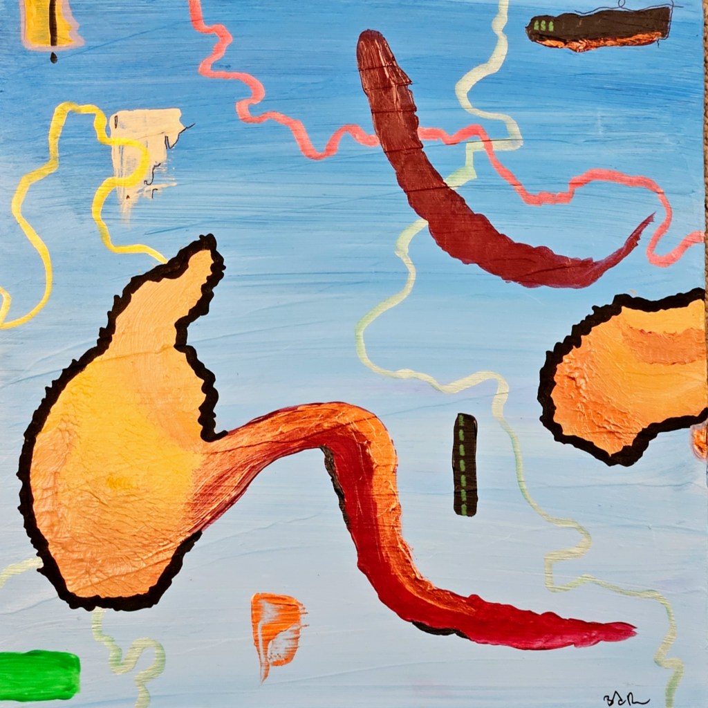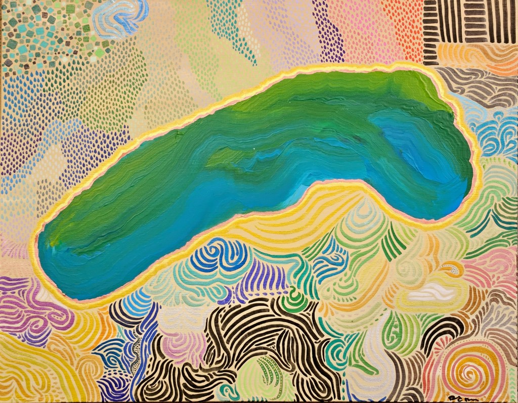 “Sinking Roots, Bright Delay” – Acrylic, marker, & ink on paper.“Soft Form Studies #6: The Crossing” – Acrylic and ink on wood panel“The Solace of Ambience” – Marker, gel pen, acrylic on paper.“Calm Pools” – Acrylic on canvas“The Soft Collapsing Hours – felt tip pen, paper (Tender Blueprints & the Unknown Kin, Fragment VII)“Outer Creep” – Marker, acrylic, gel pen on paper“Gasoline Flowers #1” – digital photograph