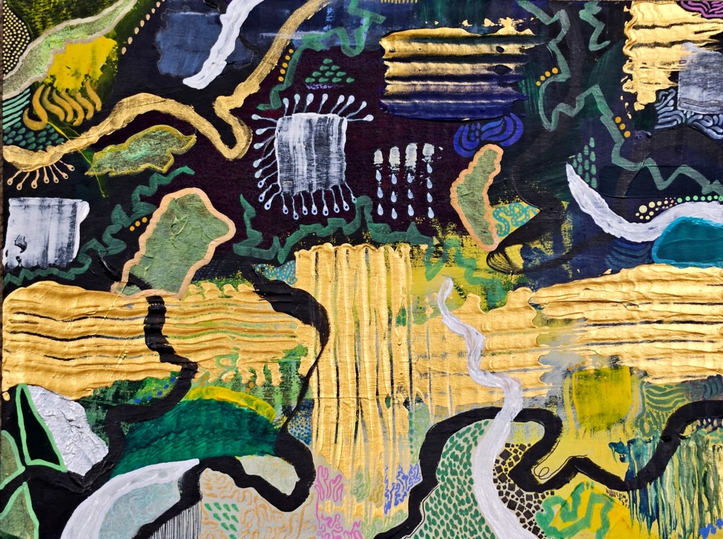 “Mythogenesis” – Acrylic on cardboard“Green Stills the Dark” – Marker, gel pan, acrylic on paper“Fog & Beacons” – digital photograph“Riot Field” – Acrylic and ink on canvas“Dreams in the Faultline” – Acrylic on cardboard“Soft Form Studies #2: Blue Suspension” – Acrylic and ink on wood panel“The Body Was a Country” – Acrylic and ink on cardboard