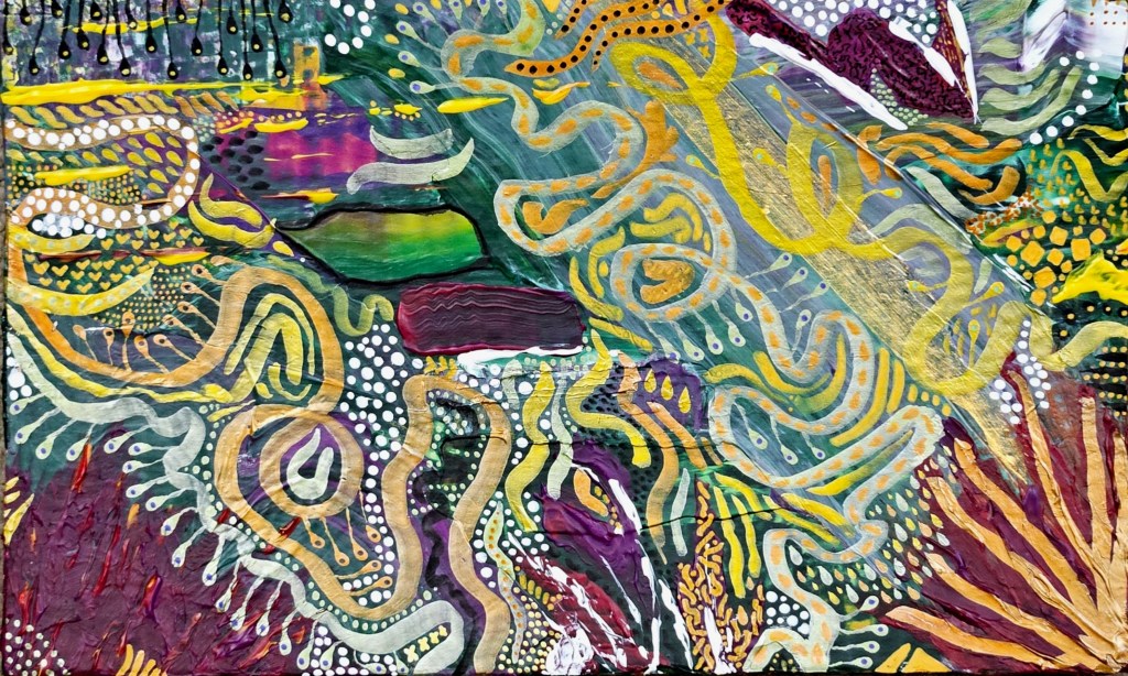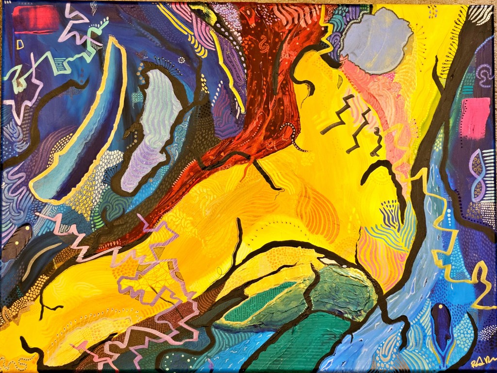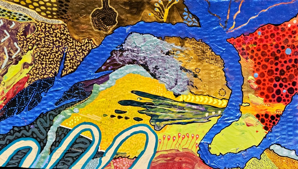 “Petaling” – Marker, acrylic, ink on paper“Warmth Wanders” – Acrylic and ink on cardboard“Feral Language” – Acrylic and ink on cardboard“Dreamstarter” – Acrylic, ink, & mixed media on wooden panel